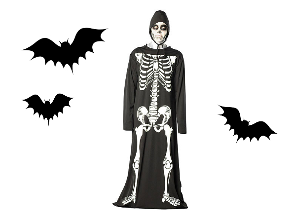 Vedä kaapu ylle ja huppu päähän. Helppo ja mukava kokoasu, jossa luut hohtavat pimeässä.
